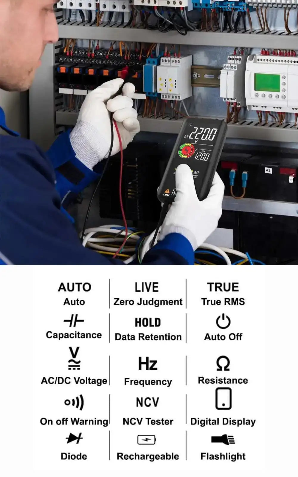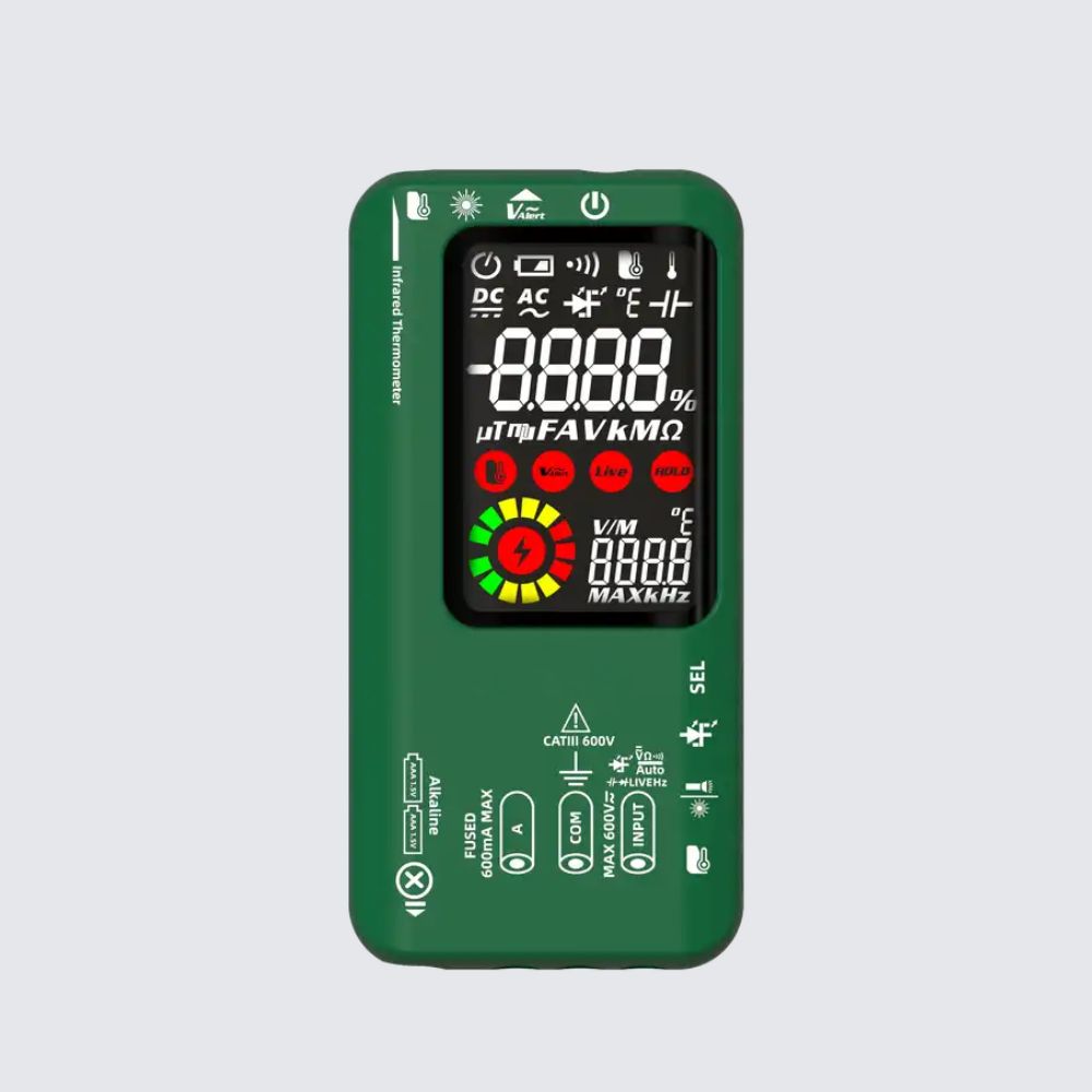The Smart Digital Multimeter can measure AC or DC voltage, capacitance, ambient temperature, frequency, resistance, continuity, and diodes.
